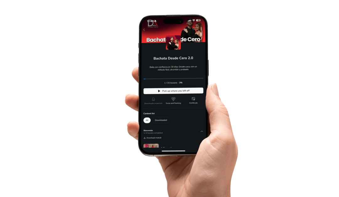 Aquí vas a tener acceso a todos los bonos como playlist exclusiva de bachata, programa de pasos, código de descuento, clases extras y más.